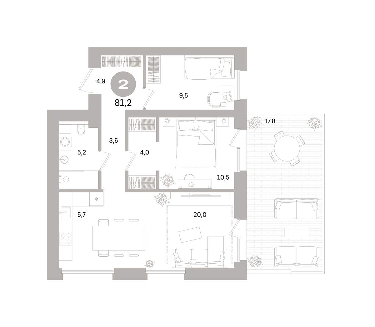 Жилая площадь 24.83 м2, кухня 28.22 м2, предчистовая отделка, совмещенных санузлов - 2.