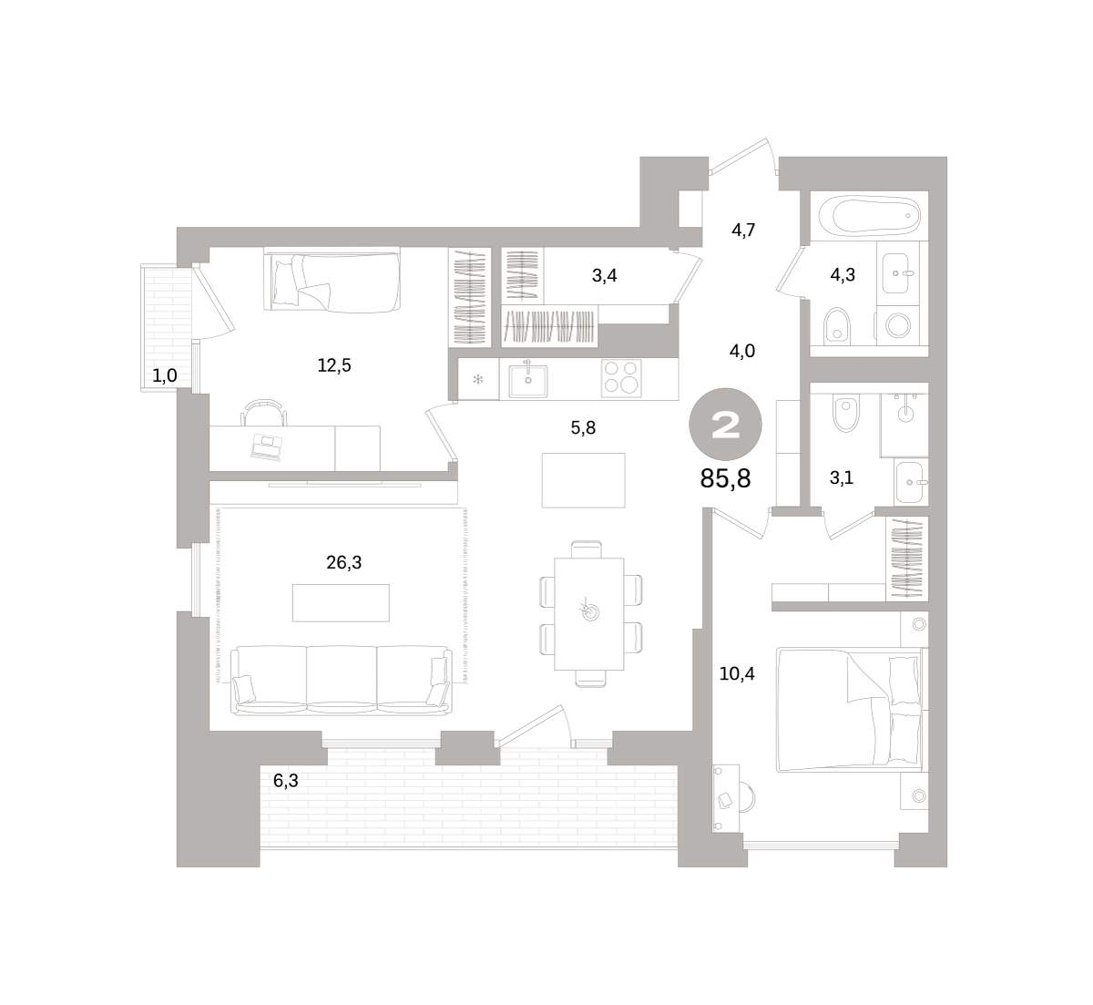 Жилая площадь 21.61 м2, кухня 24 м2, предчистовая отделка, совмещенных санузлов - 2, балконов - 1.