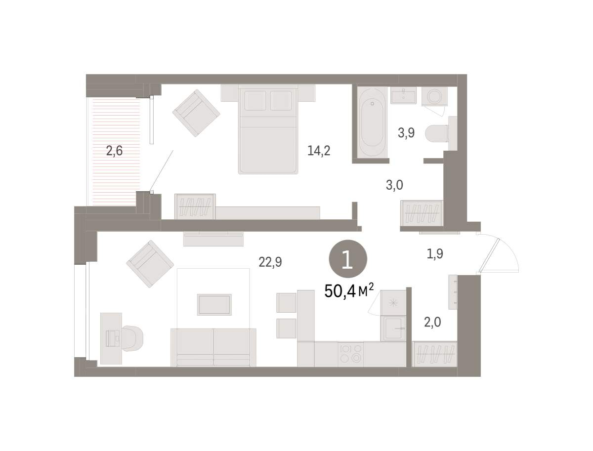 Жилая площадь 17.58 м2, кухня 22.86 м2, предчистовая отделка, совмещенных санузлов - 2, балконов - 1.