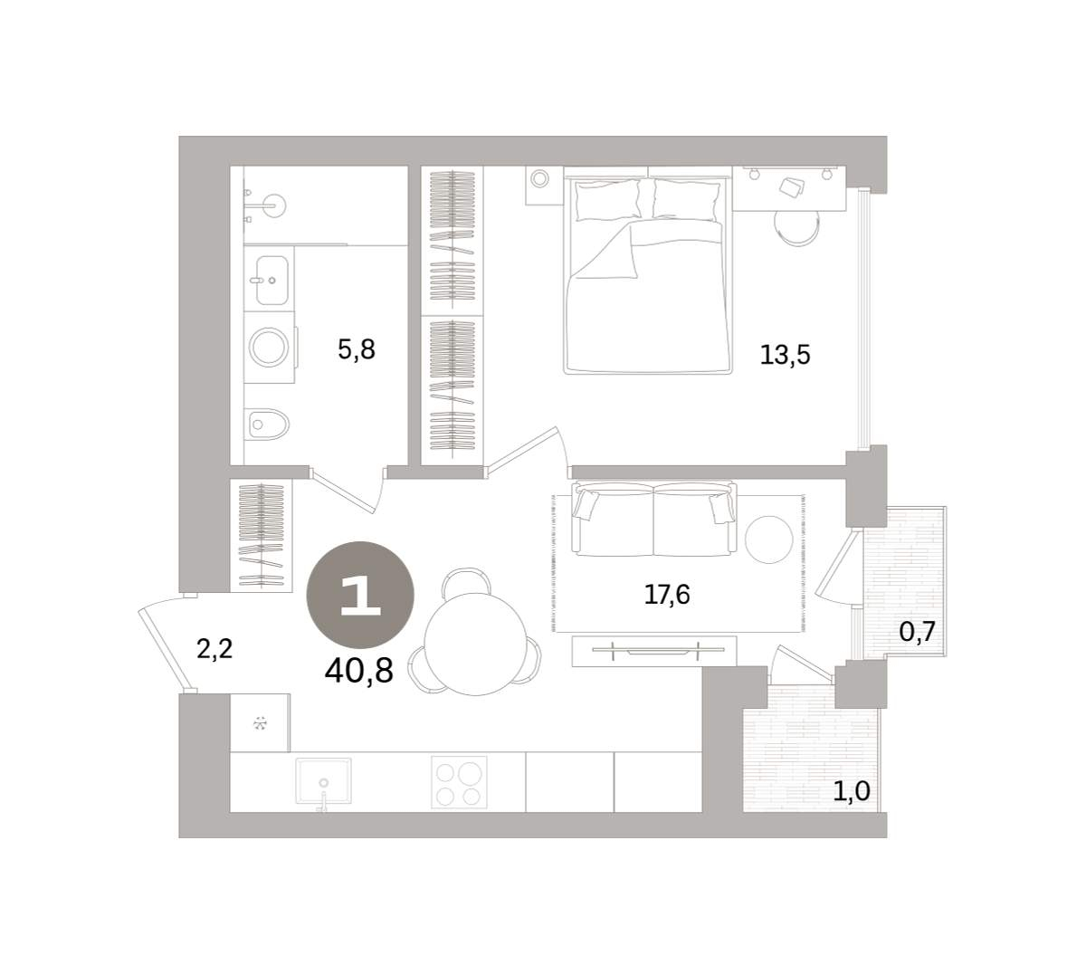 Жилая площадь 14.15 м2, кухня 22.04 м2, предчистовая отделка, совмещенных санузлов - 1.