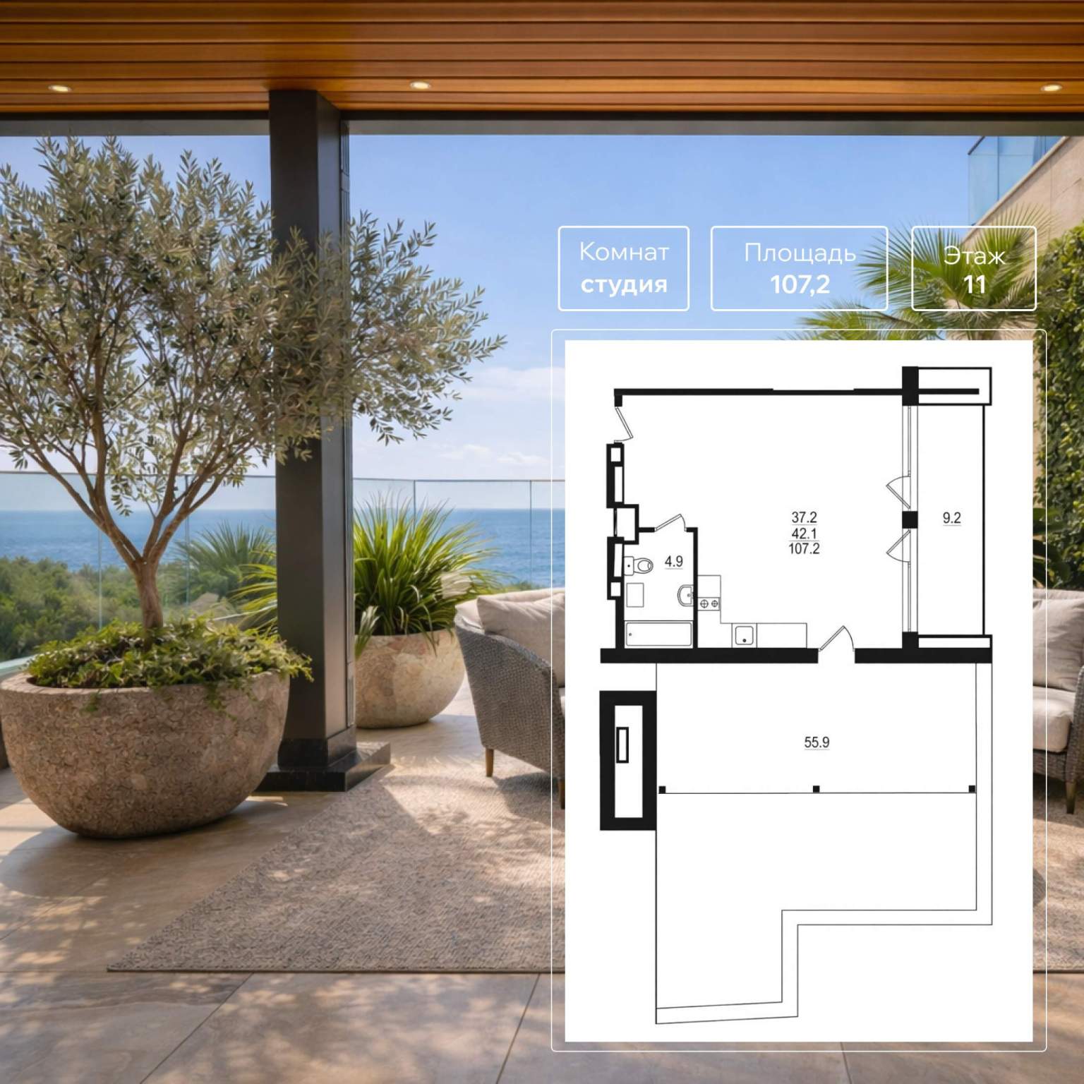 Студия расположена на 11 этаже, что обеспечивает роскошные виды. На просторной террасе можно устроить летнюю кухню, зону барбекю или обустроить лаунж-площадку для друзей и вечеров под звездами.