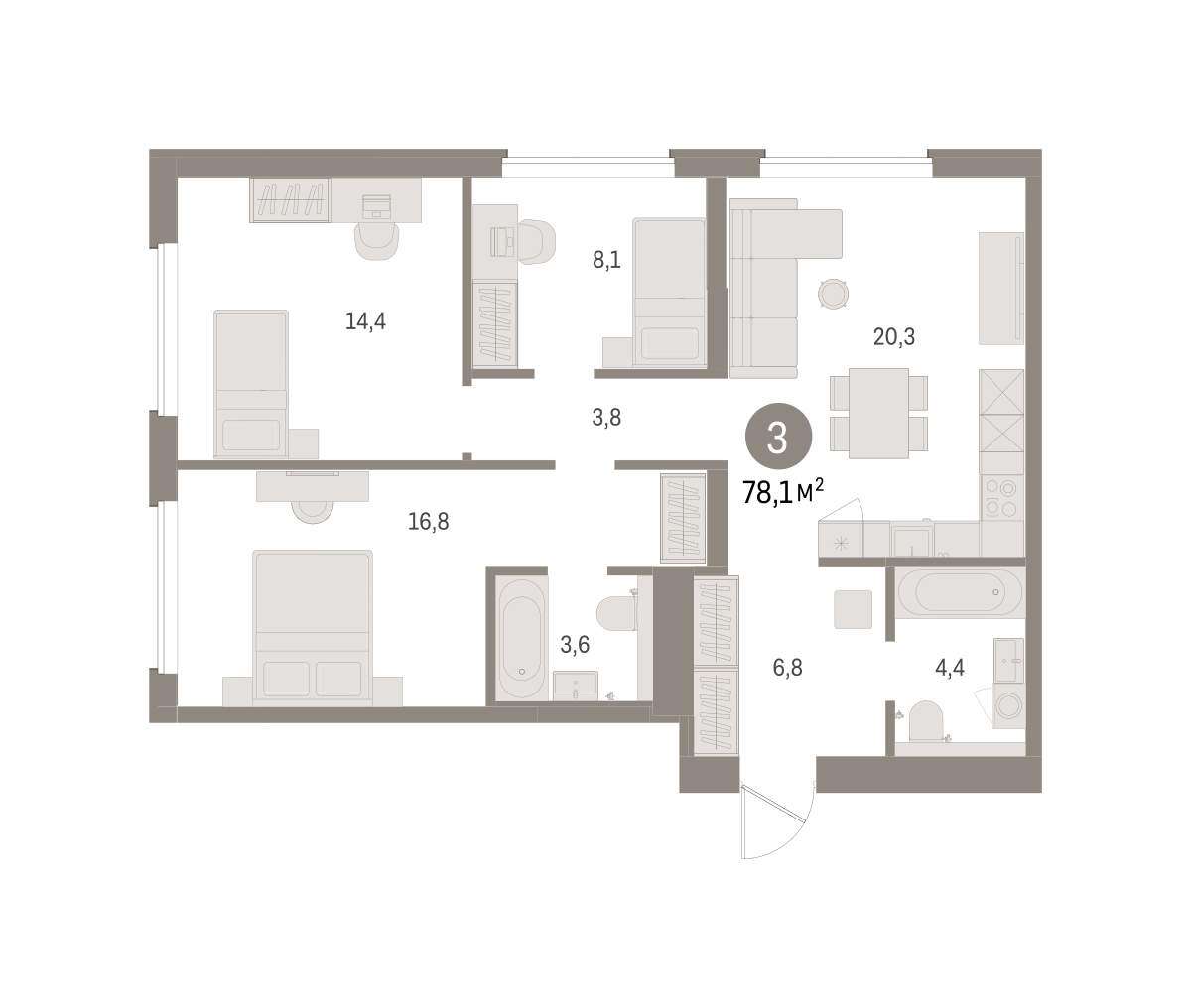 Жилая площадь 33.35 м2, кухня 18.28 м2, предчистовая отделка, совмещенных санузлов - 2.