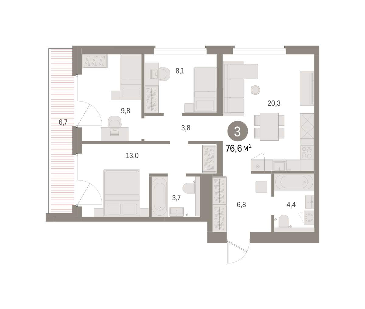 Жилая площадь 32.44 м2, кухня 19.51 м2, предчистовая отделка, совмещенных санузлов - 2.