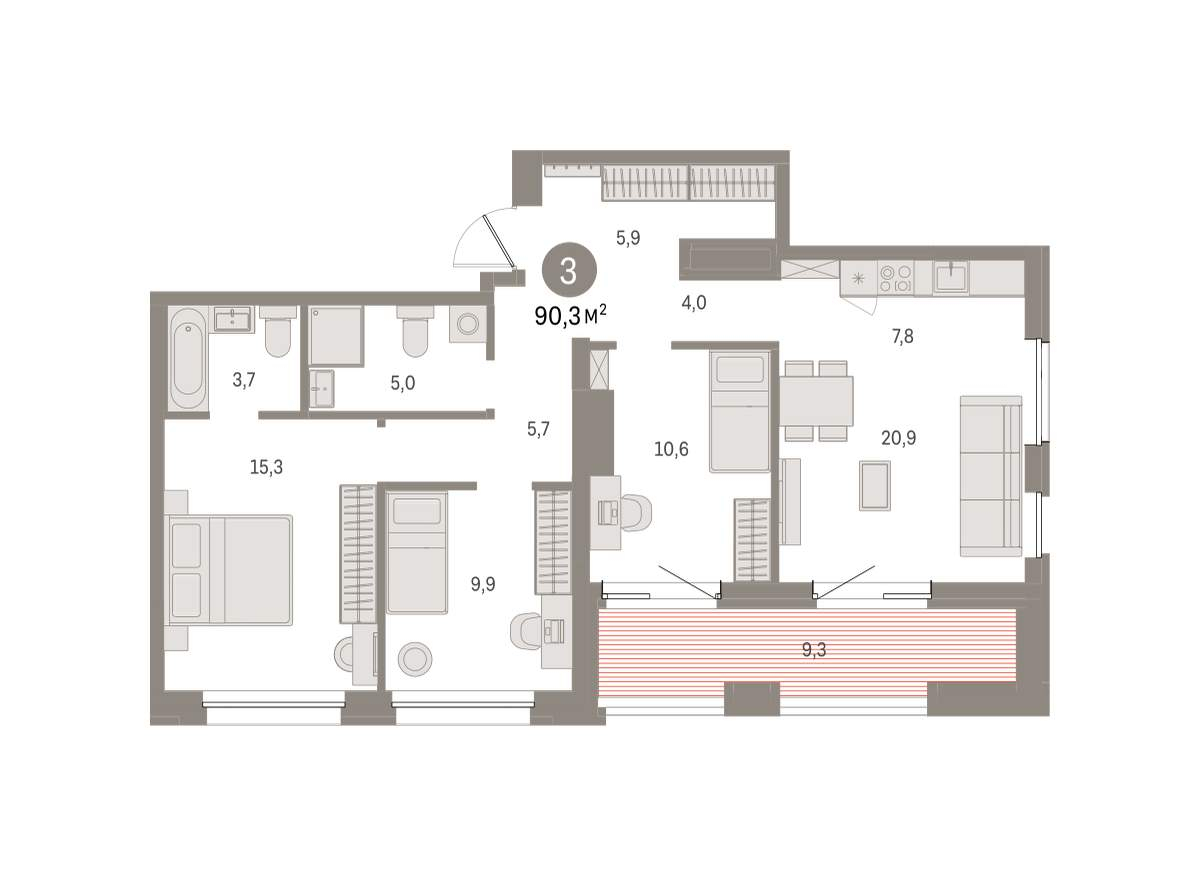 Жилая площадь 40.98 м2, кухня 42.48 м2, предчистовая отделка, совмещенных санузлов - 2.