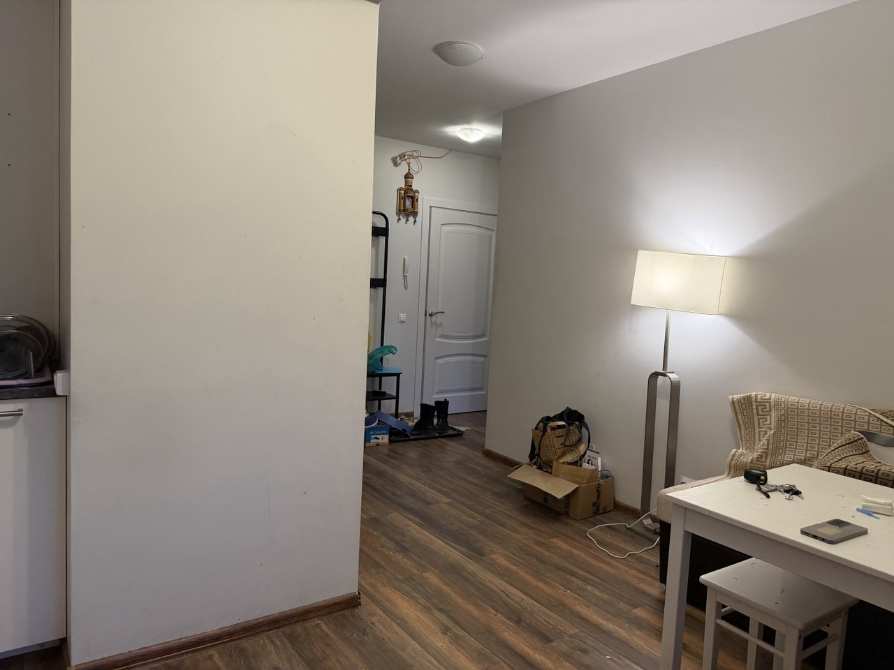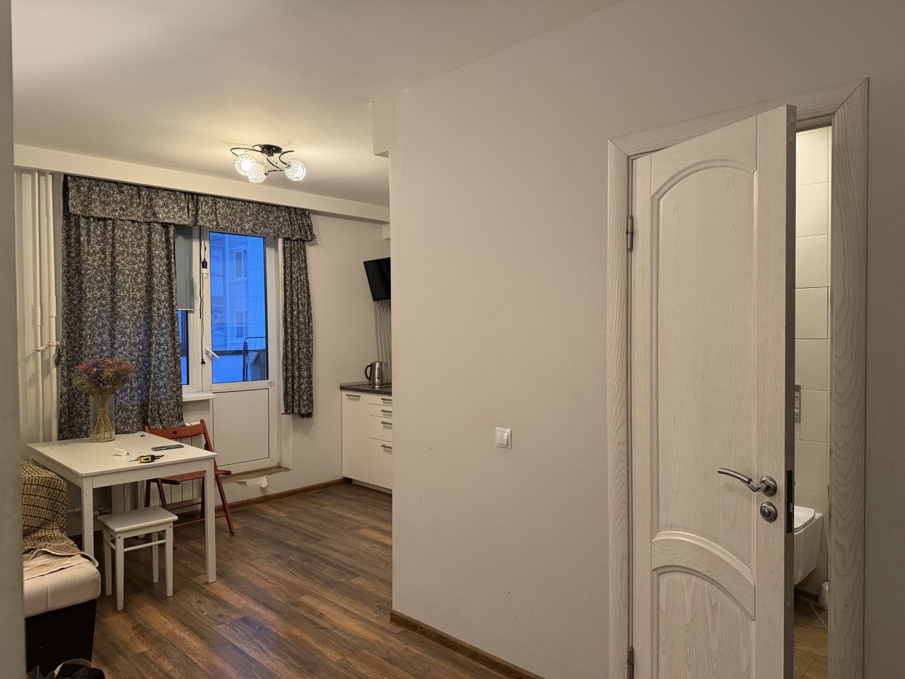 В квартире сделана перепланировка – увеличена зона кухни. Мокрые точки – не перенесены. На плане отражены текущие характеристики объекта. Комната – 17,3 кв.м., кухня – 12,7 кв.м., совмещенный санузел, застекленная лоджия, гардеробная с системой хранения.